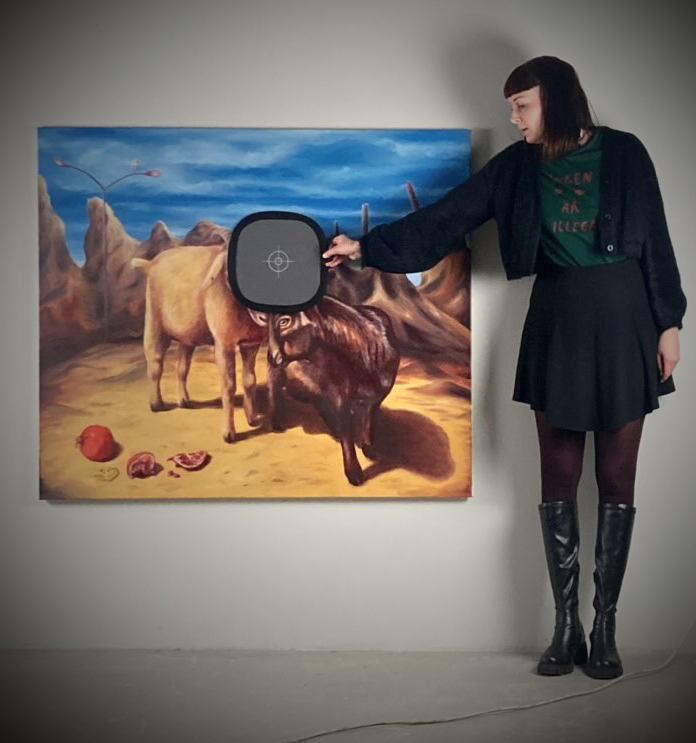 Katarina Andersson (b. 1990, Södertälje) is a visual artist based in Stockholm who primarily works in oil on canvas. She works figuratively, often with bold colours and organic shapes. The paintings are filled with symbolism and open up windows to a surreal world where the focus is on the animals point of view. Katarina is interested in storytelling, and to find alternative and overlooked perspectives. Lately she has explored this by challenging anthropocentrism and letting animals be main characters in her work. The paintings illustrate the twistedness of the world, but also include something magical and hopeful. She is fascinated by symbolism and how objects can be read completely differently, depending on the setting and the viewer’s point of view.